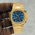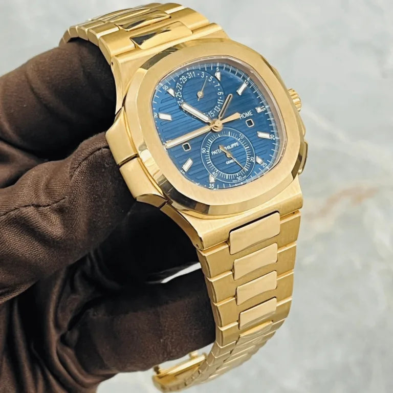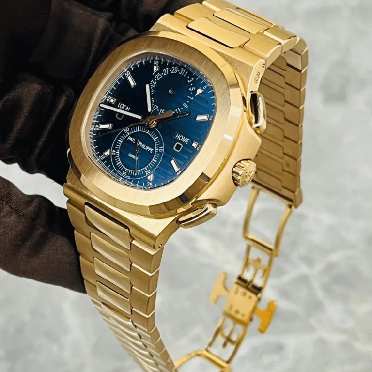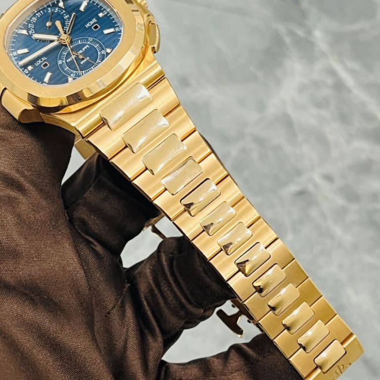 The Patek Philippe Nautilus has long been regarded as a true icon in the world of luxury watches. Designed by the legendary Gerald Genta in 1976, the Nautilus has since become synonymous with timeless elegance and unparalleled craftsmanship. The Patek Philippe Nautilus 40 Travel Time Rose Gold Blue Dial is a stunning addition to this illustrious lineage. Crafted from the finest rose gold, the 40mm case exudes a warm and luxurious aesthetic, while the captivating blue dial, adorned with luminescent index hour markers, adds a touch of contemporary flair to the classic Nautilus design. Powered by the Calibre CH 28-520 C, a self-winding mechanical movement with a 55-hour power reserve, the Nautilus 40 Travel Time Rose Gold Blue Dial delivers exceptional timekeeping precision and reliability. The rose gold bracelet, equipped with a deployment clasp, provides a secure and comfortable fit that can be easily adjusted to suit any occasion. Whether you're traveling the globe, attending a formal event, or simply enjoying a leisurely day, the Patek Philippe Nautilus 40 Travel Time Rose Gold Blue Dial is the perfect companion.